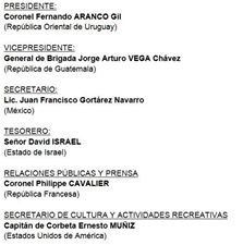 Crnel Wang Yong (Corea del Sur), Juan Francisco Gortarez (Mexico), TCor William Hogan (EEUU), Cap.N. John Pestovic (EEUU), Crnel Philipe Cavalier (Francia), Crnel Carlos Bustos (España), Sra. Malena de Avilez, Sra. Vanessa de Castellanos, Sra. Nicolle Antonelli, Sra. Shelly Burgoin y Sra. Marianella de Flores.